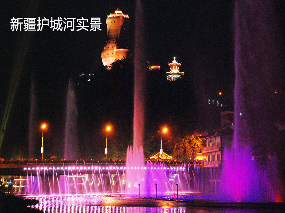 新疆護(hù)城河音樂(lè)噴泉通過(guò)程序控制系統(tǒng)和音樂(lè)控制系統(tǒng),對(duì)音樂(lè)進(jìn)行編程,使噴泉造型與音樂(lè)旋律、燈光同步結(jié)合而產(chǎn)生千變?nèi)f化的水景,高端大氣..